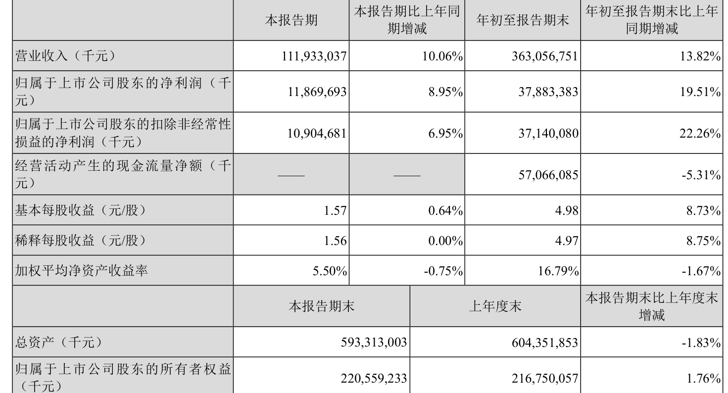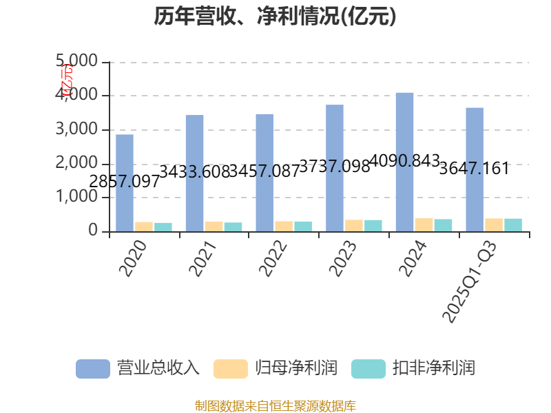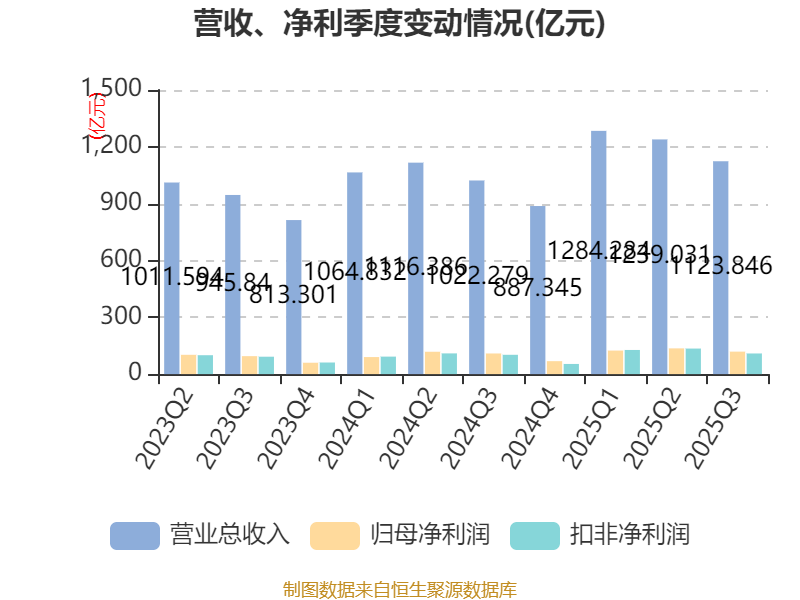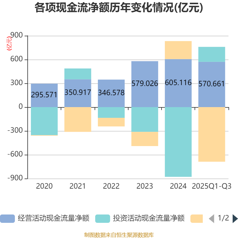 2025年前三季度,公司经营活动现金流净额为570.66亿元,同比下降5.31%;筹资活动现金流净额-688.43亿元,同比减少888.04亿元;投资活动现金流净额188.51亿元,上年同期为-905.64亿元。