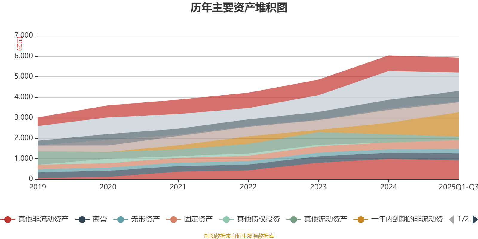 资产重大变化方面,截至2025年三季度末,公司一年内到期的非流动资产较上年末增加114.8%,占公司总资产比重上升10.9个百分点;货币资金较上年末减少36.03%,占公司总资产比重下降8.09个百分点;其他流动资产较上年末减少57.34%,占公司总资产比重下降3.74个百分点;存货较上年末减少24.14%,占公司总资产比重下降2.38个百分点。