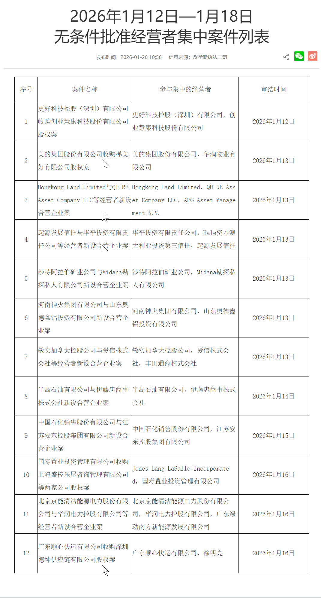 1月26日,市场监管总局发布2026年1月12日—1月18日无条件批准经营者集中案件列表,其中包括美的集团股份有限公司收购梯美好有限公司股权案、广东顺心快运有限公司收购深圳德坤供应链有限公司股权案等。