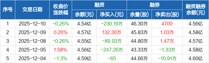 吉林化纤:融资净偿还230.19万元,融资余额4.54亿元(12-10)