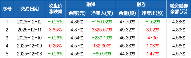 吉林化纤:融资净偿还150.02万元,融资余额4.86亿元(12-12)