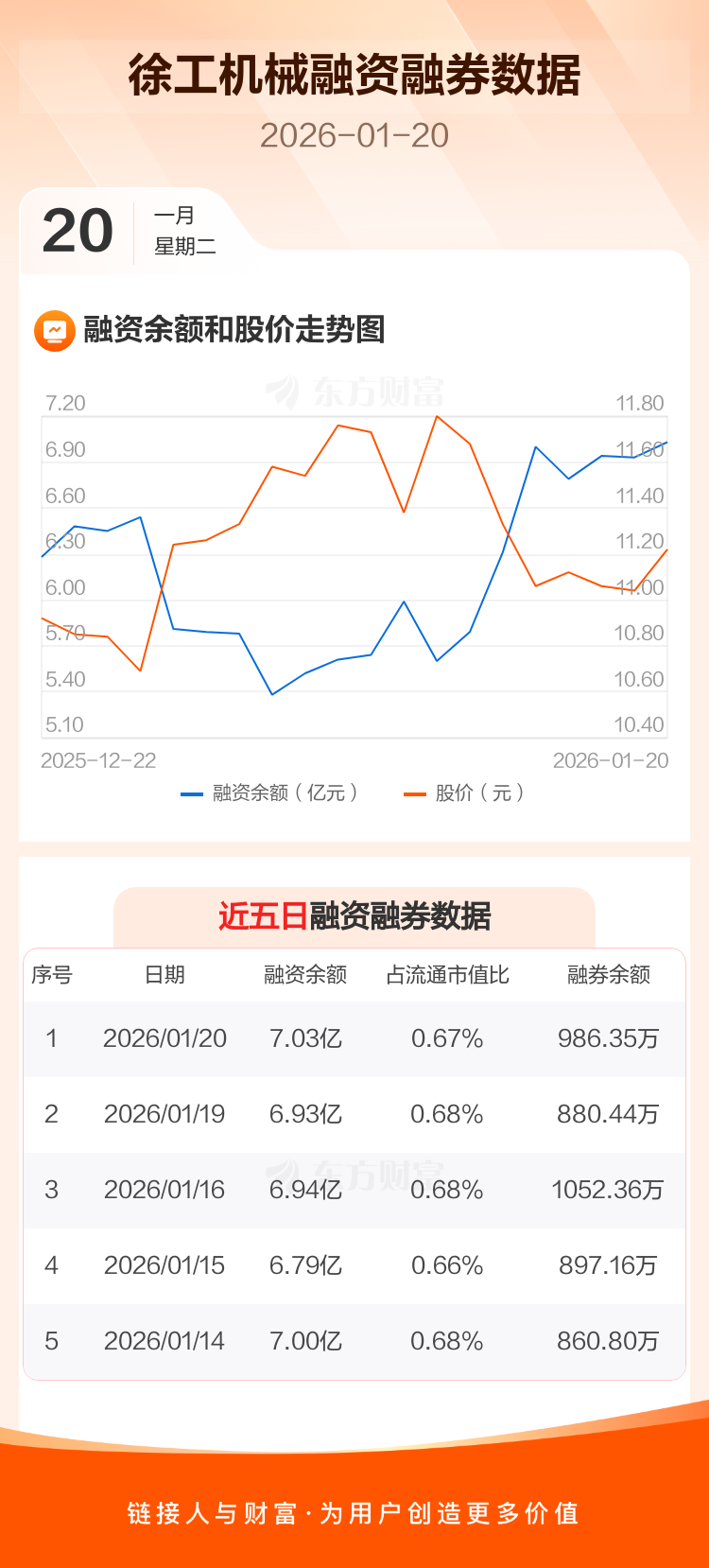 交易所最新数据显示,徐工机械于2026年1月20日获融资买入5246.70万元,融资偿还4248.44万元,当日融资净买入998.26万元。目前,该股融资余额7.03亿,占流通市值比例为0.67%。