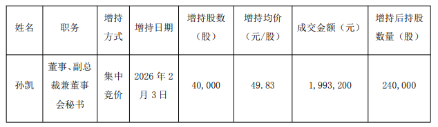 2月3日晚间,兴业银锡公告称,基于对公司未来发展的信心及长期投资价值的认可,公司董事、副总裁兼董事会秘书孙凯于2026年2月3日通过集中竞价交易方式买入公司股份40,000股,占公司总股本的0.0023%。
