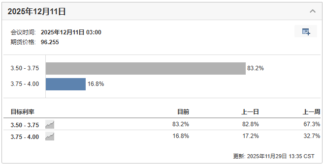 目前交易员们正在加大力度押注美联储将在12月议息会议进一步降息。据CME“美联储观察”,截至北京时间12月1日11时,美联储12月降息25个基点的概率升至83%。另外,摩根大通也火速“撕报告”,该行目前认为美联储将于12月降息,改变了一周前关于美联储将推迟降息至明年1月的判断。