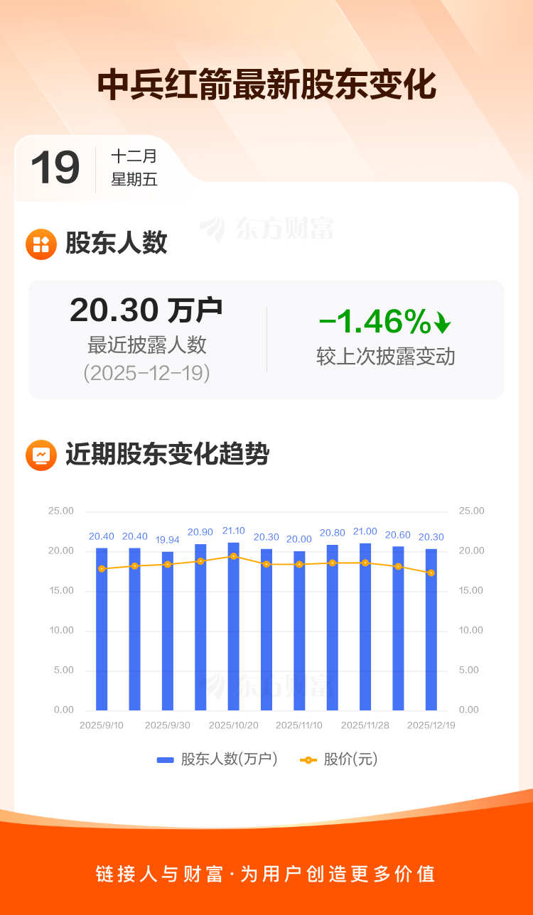中兵红箭最新披露数据显示,截至12月19日公司股东户数为20.30万户,较上期(2025年12月10日)减少3000户,降幅为1.46%。户均持有流通股数量由上期的6759股上升至6859股,户均持股金额由上期的12.23万元减少至11.85万元。