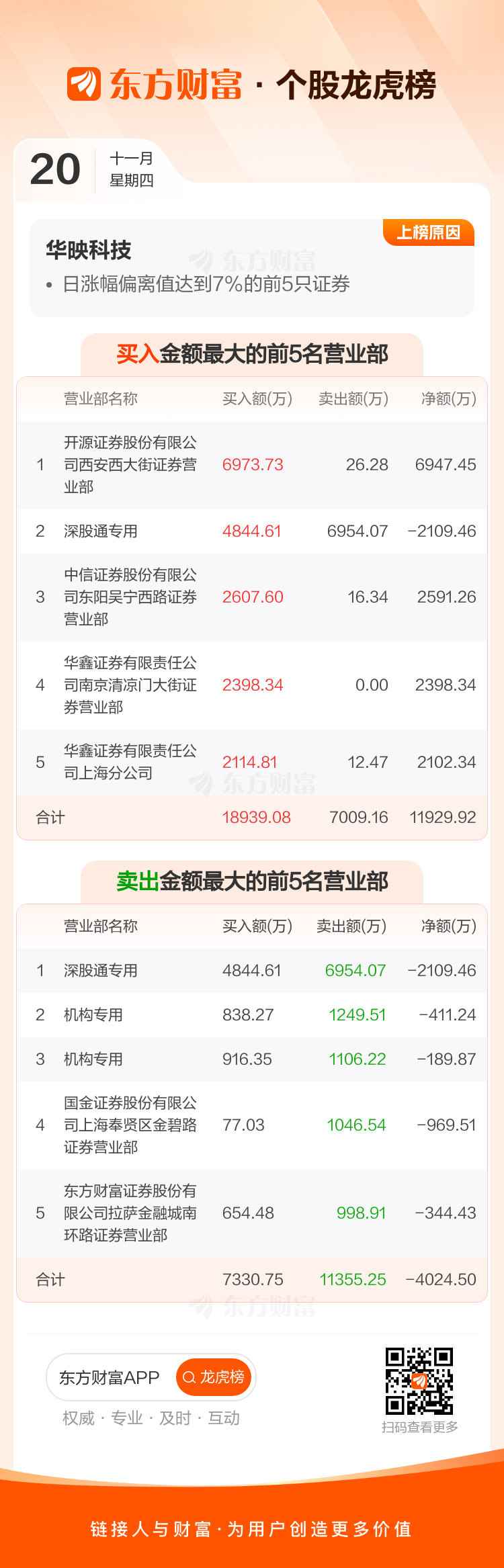 交易所2025年11月20日公布的交易公开信息显示,华映科技因成为日涨幅偏离值达到7%的前5只证券上榜。华映科技当日收报5.62元,涨跌幅9.98%,偏离值10.77%,换手率8.12%,成交额12.19亿。