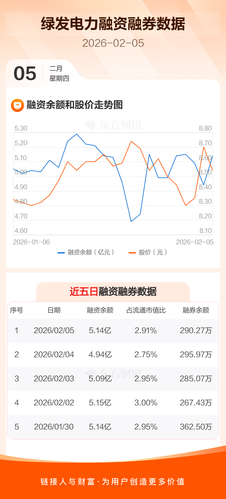 交易所最新数据显示,绿发电力于2026年2月5日获融资买入3043.31万元,融资偿还1086.90万元,当日融资净买入1956.41万元。目前,该股融资余额5.14亿,占流通市值比例为2.91%。
