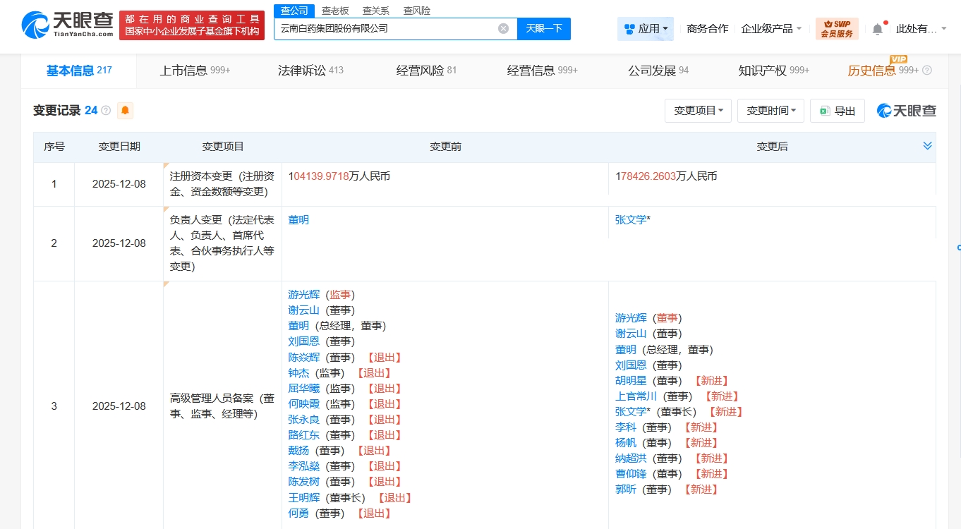 每经AI快讯,天眼查工商信息显示,近日,云南白药(000538)发生工商变更,董明卸任法定代表人,王明辉卸任董事长,由张文学接任,注册资本由约10.4亿元人民币增至约17.8亿元人民币,同时,多位高管发生变更。云南白药集团股份有限公司成立于1993年11月,经营范围含化学原料药、化学药制剂、中成药、中药材、生物制品、医疗器械等的销售,信息技术、科技及经济技术咨询服务,货物进出口等。股东信息显示,该公司由云南省国有股权运营管理有限公司、新华都实业集团股份有限公司、云南合和(集团)股份有限公司等共同持股。据媒体报道,云南白药11月10日发布公告,公司第十一届董事会2025年第一次会议选举张文学为董事长,董明为副董事长,任期三年。