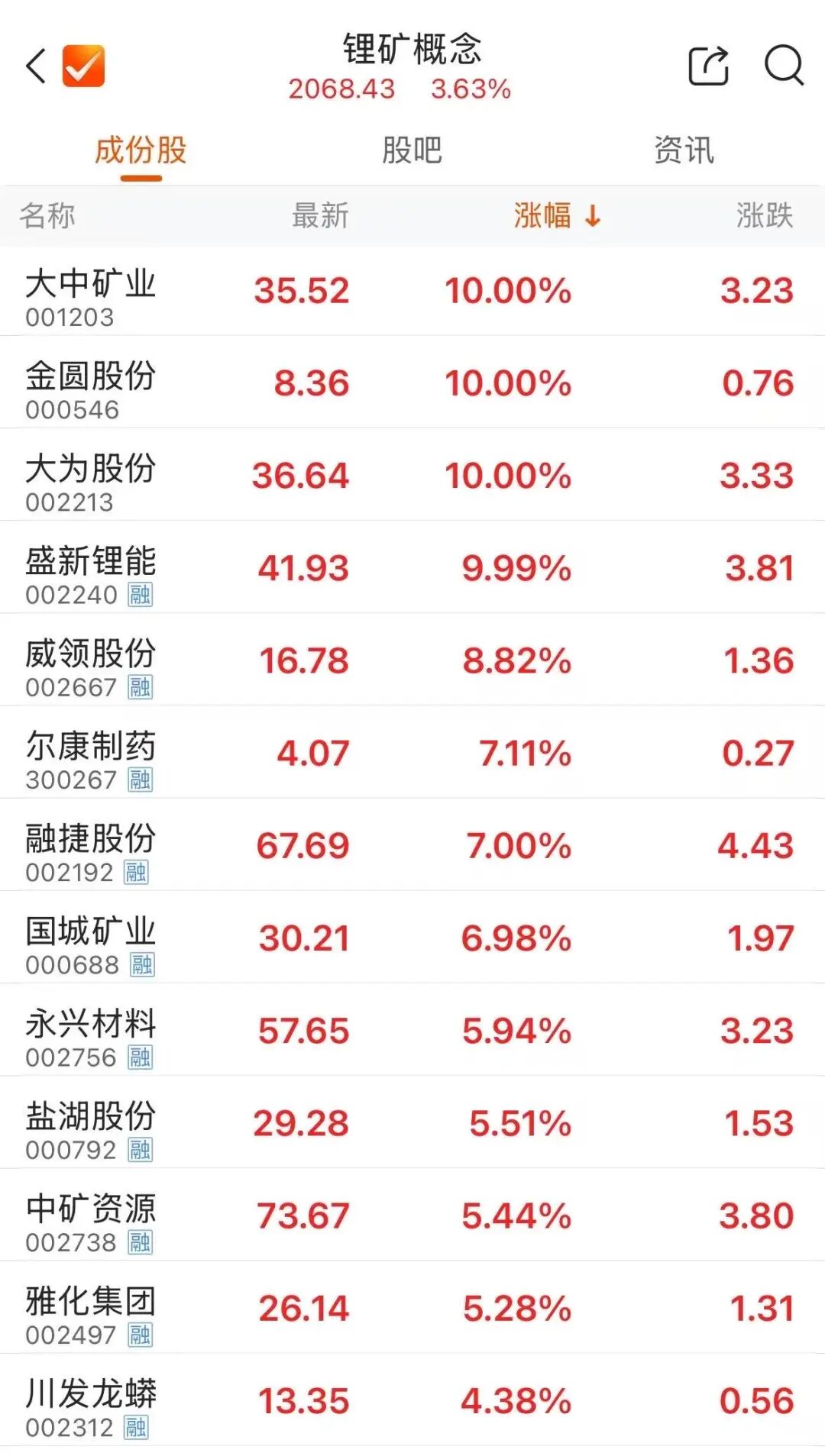 锂矿概念早盘反复走强,大为股份(002213)3连板,金圆股份(000546)4连板。盛新锂能涨停,威领股份、融捷股份、盐湖股份等涨幅靠前。消息面上,继昨日突破100000元/吨关口后,广期所碳酸锂期货主力合约盘中一度突破102000元/吨。