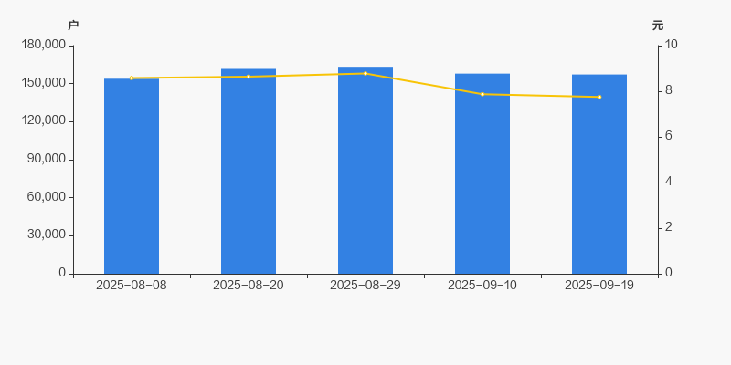 2025年8月8日至今,公司股东户数有所增长,区间涨幅为2.19%。2025年8月8日至2025年9月19日区间股价下降9.67%。