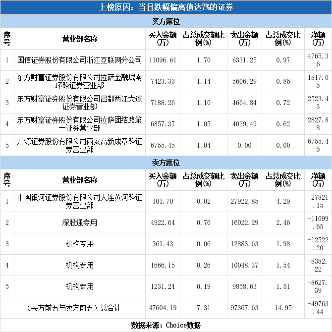 多主力现身龙虎榜,航天发展跌停(11-26)