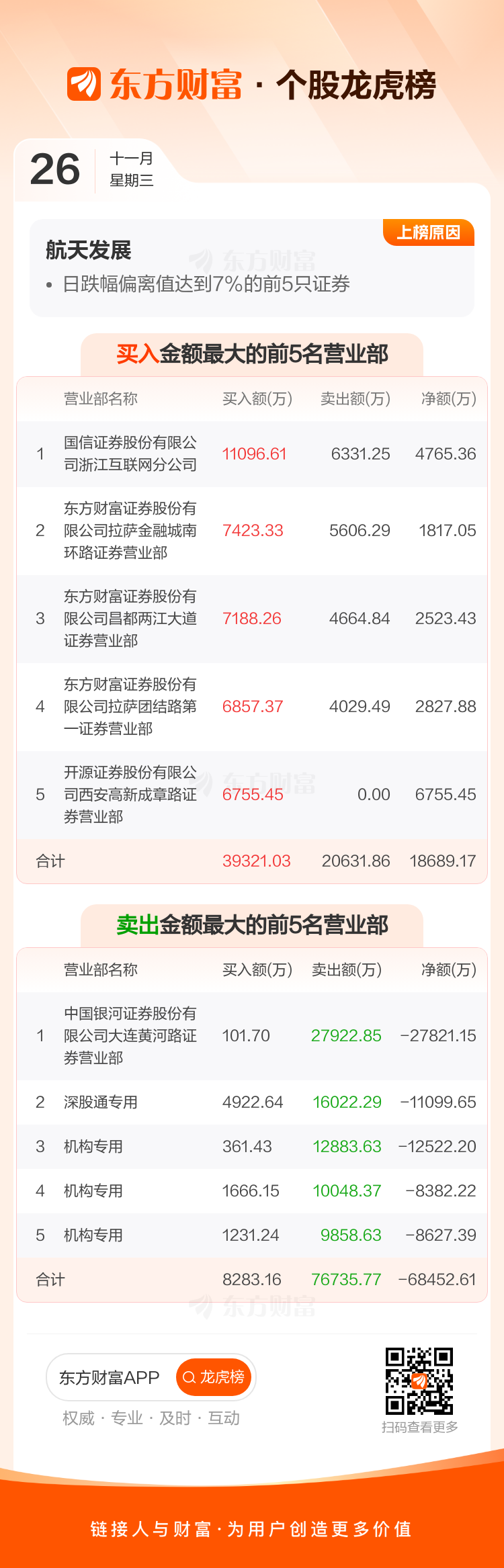 交易所2025年11月26日公布的交易公开信息显示,航天发展因成为日跌幅偏离值达到7%的前5只证券上榜。航天发展当日收报12.69元,涨跌幅-10.00%,偏离值-10.34%,换手率31.20%,成交额65.14亿。