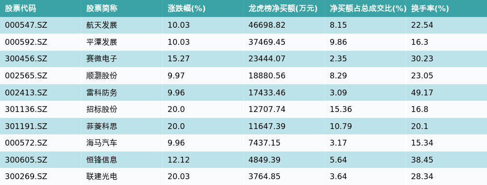 南财智讯12月2日电,南财金融终端数据显示,因当日异动登上龙虎榜的个股中,资金净买入最多的前三位分别是航天发展(000547.SZ)、平潭发展(000592.SZ)与赛微电子(300456.SZ)。其中排名第一的航天发展净买额达4.67亿元,占总成交金额的8.15%。航天发展当日收盘上涨10.03%,换手率为22.54%,净买入额前10个股详情见下图: