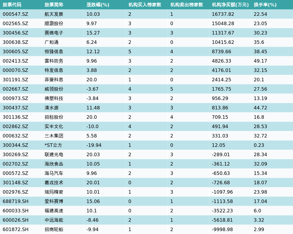 南财智讯12月2日电,南财金融终端数据显示,因当日异动登上龙虎榜的个股中,24只沪深A股龙虎榜出现了机构的身影,机构合计净买入55376.71万元,具体来看,机构净买入15只个股,净卖出9只个股。其中,机构净买入前三分别为航天发展(000547.SZ)、顺灏股份(002565.SZ)与赛微电子(300456.SZ),详情见下图:机构净卖出的个股中,前三分别为招商轮船(601872.SH)、中远海能(600026.SH)与福建高速(600033.SH)。