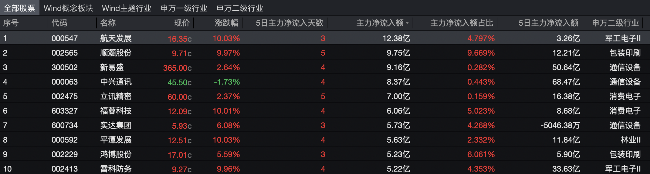 上证报中国证券网讯(记者窦世平)Wind数据显示,12月2日,当日主力资金净流入额排名前十个股包括航天发展、顺灏股份、新易盛、中兴通讯、立讯精密、福蓉科技、实达集团、平潭发展、鸿博股份、雷科防务。净流入额均超5亿元,其中,最高为航天发展,净流入额超12亿元。通信设备、航天军工、包装板块资金流入额位列前三,分别为35.50亿元、24.61亿元、18.08亿元。