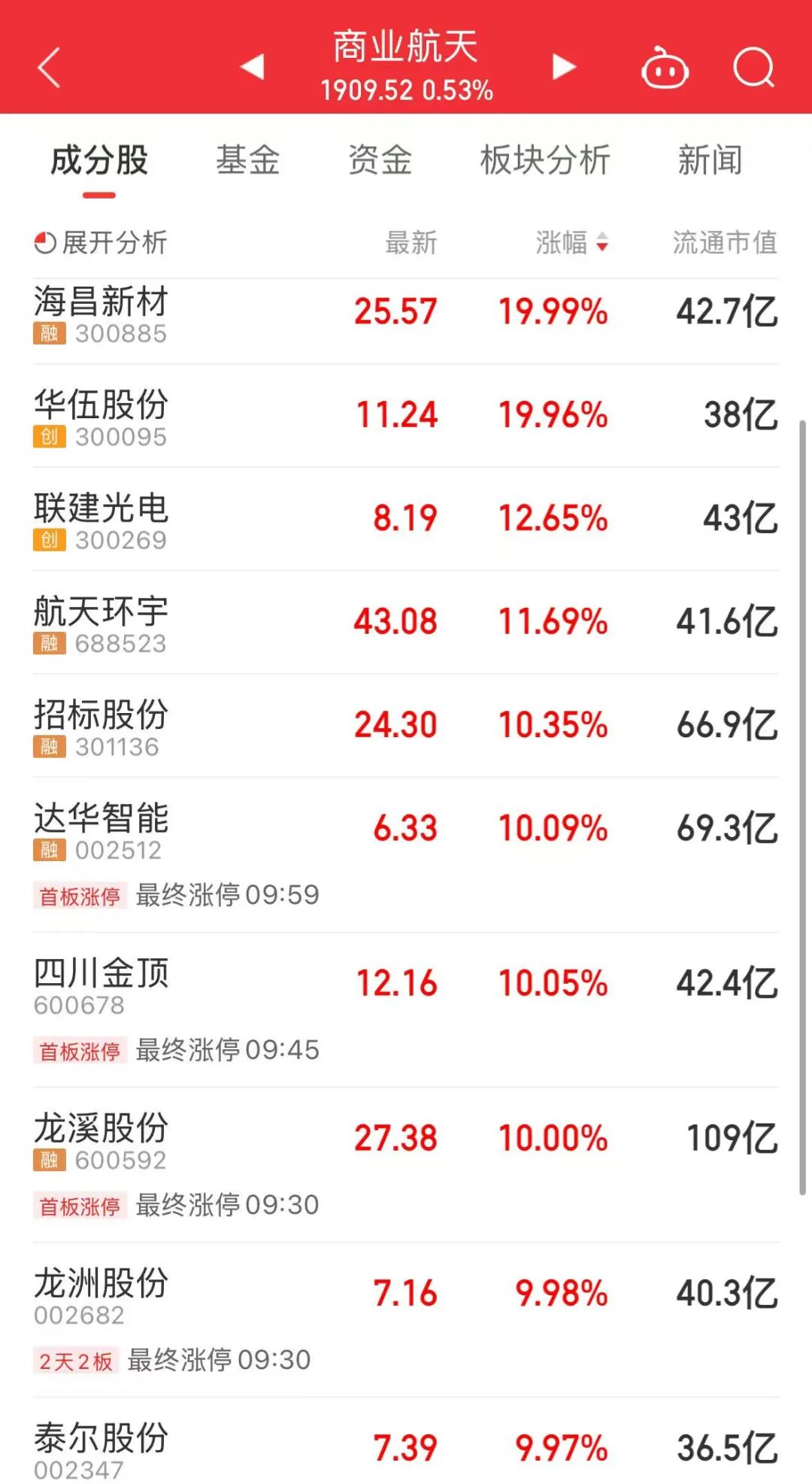 今天上午,商业航天板块掀起涨停潮。其中,海昌新材、华伍股份迎来“20CM”涨停。