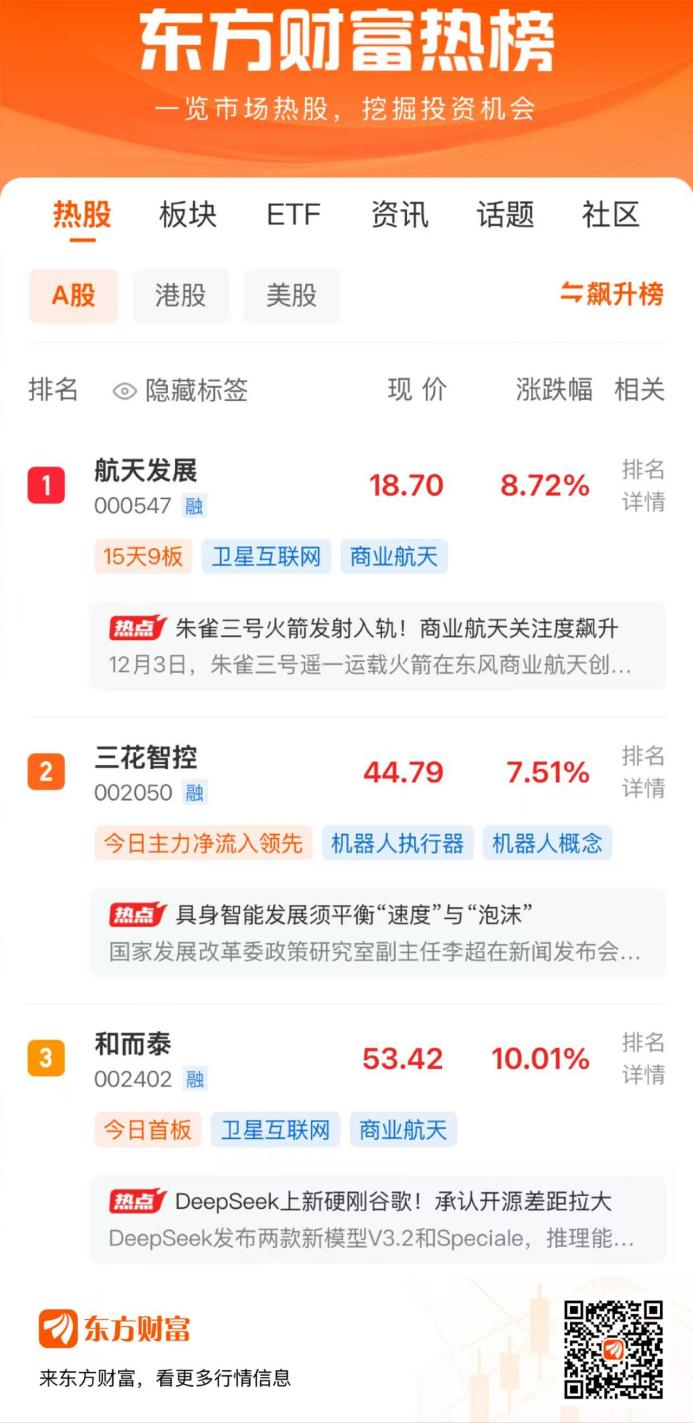 12月4日,两市震荡分化,三大指数涨跌不一。东方财富热股榜前三的股票中,航天发展位列第1,三花智控位列第2,和而泰位列第3。