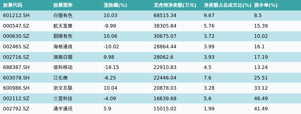 南财智讯1月26日电,南财金融终端数据显示,因当日异动登上龙虎榜的个股中,龙虎榜中资金净流出最多的前三位分别是白银有色(601212.SH)、航天发展(000547.SZ)与铜陵有色(000630.SZ)。其中排名第一的白银有色被净卖出6.85亿元,占总成交金额的9.67%。白银有色收盘上涨10.03%,换手率为8.5%。净卖出额前10个股详情见下图: