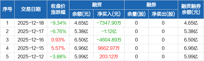 融资方面,当日融资买入9097.19万元,融资偿还1.64亿元,融资净偿还7347.9万元,连续3日净偿还累计2.31亿元。融券方面,融券卖出0股,融券偿还0股,融券余量0股,融券余额0元。融资融券余额合计4.65亿元。