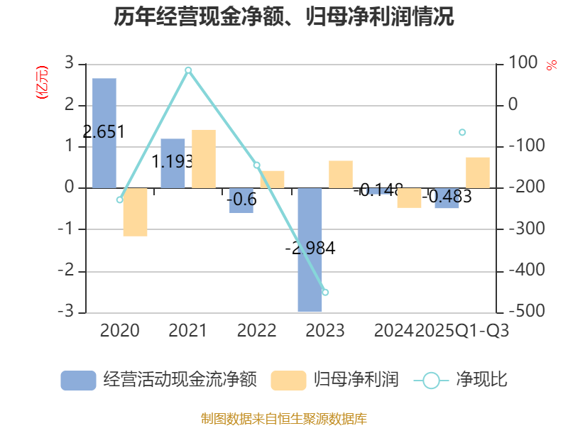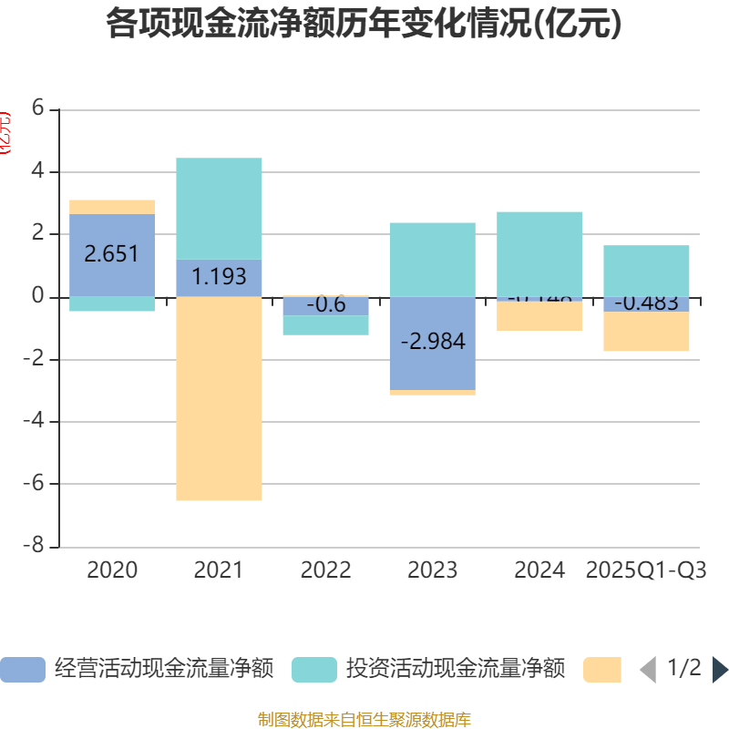 2025年前三季度,公司经营活动现金流净额为-4830.6万元,同比减少3963.56万元;筹资活动现金流净额-1.25亿元,同比减少3282.29万元;投资活动现金流净额1.65亿元,上年同期为2.21亿元。