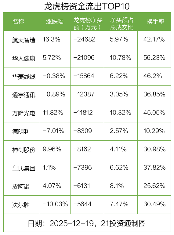 而龙虎榜中资金净流出最多的是航天智造(300446.SZ),被净卖出为2.47亿元,占总成交金额的5.97%。航天智造收盘上涨16.3%,换手率为42.17%。