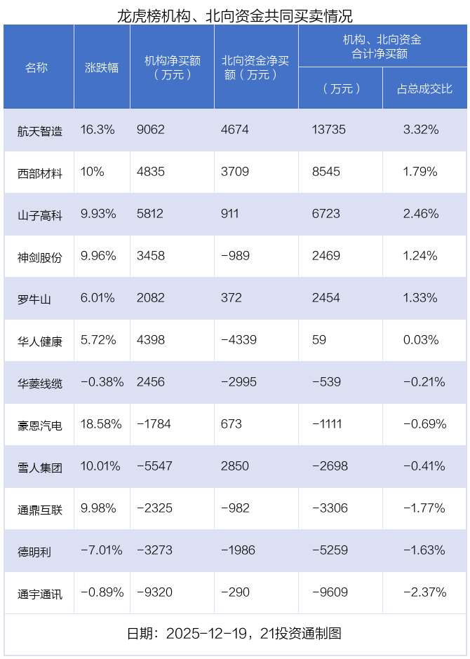 值得注意的是,机构和北向资金共同净买入了航天智造、西部材料、山子高科、罗牛山等4股;共同净卖出了通宇通讯、通鼎互联、德明利等3股;在雪人集团,豪恩汽电,神剑股份,华菱线缆,华人健康上出现分歧,机构净卖出雪人集团5547.36万元,北向资金净买入2849.85万元;机构净卖出豪恩汽电1784.26万元,北向资金净买入672.97万元;机构净买入神剑股份3457.9万元,北向资金净卖出989.38万元;机构净买入华菱线缆2456万元,北向资金净卖出2994.95万元;机构净买入华人健康4397.94万元,北向资金净卖出4339.35万元。