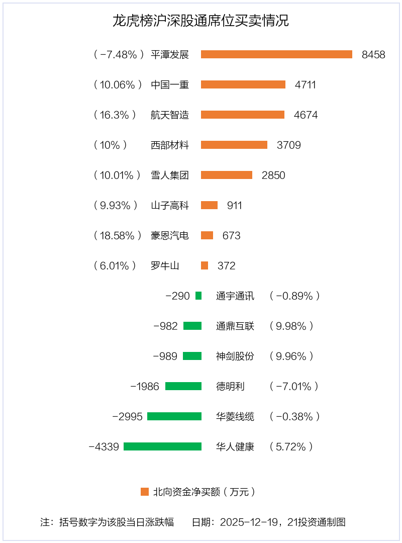 12月19日,北向资金参与龙虎榜中的个股共有14只,合计净买入1.48亿元。其中沪股通净买入1 股,,合计净买入4711.16万元;深股通净买入7 股,净卖出6 股,合计净买入1.01亿元。