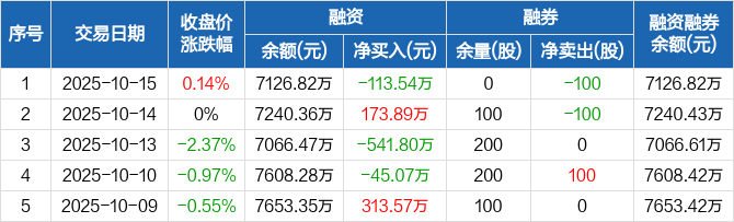 德龙汇能:融资净偿还113.54万元,融资余额7126.82万元(10-15)