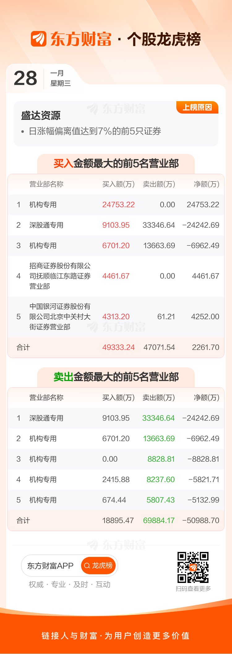 交易所2026年1月28日公布的交易公开信息显示,盛达资源因成为日涨幅偏离值达到7%的前5只证券、连续三个交易日内,涨幅偏离值累计达到20%的证券上榜。盛达资源当日收报67.28元,涨跌幅10.01%,偏离值10.01%,换手率10.36%,成交额44.31亿。异常期间1月26日至1月28日,期间涨幅30.64%,累计偏离值31.66%,区间成交额103.52亿。