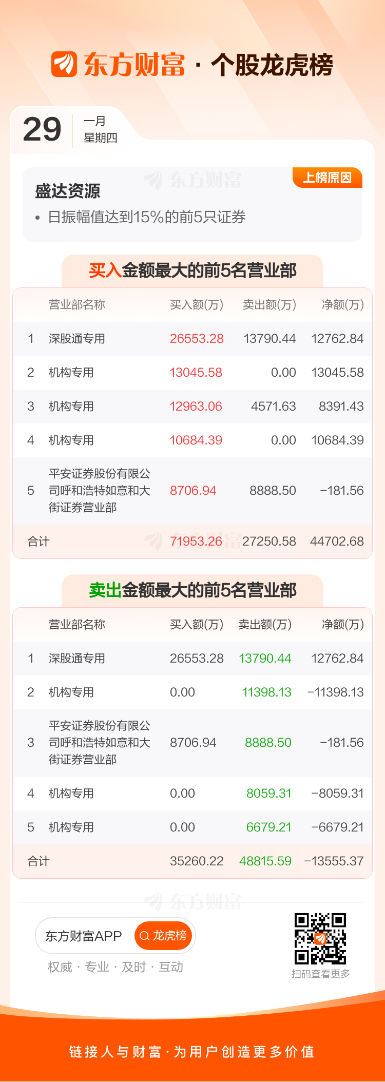 交易所2026年1月29日公布的交易公开信息显示,盛达资源因成为日振幅值达到15%的前5只证券上榜。盛达资源当日收报67.8元,涨跌幅0.77%,偏离值16.79%,换手率12.93%,成交额58.84亿。