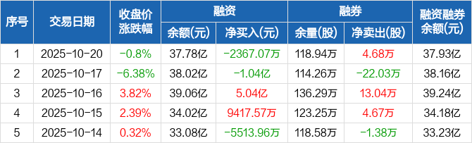 融资方面,当日融资买入1.94亿元,融资偿还2.18亿元,融资净偿还2367.07万元。融券方面,融券卖出5.85万股,融券偿还1.17万股,融券余量118.94万股,融券余额1472.46万元。融资融券余额合计37.93亿元。