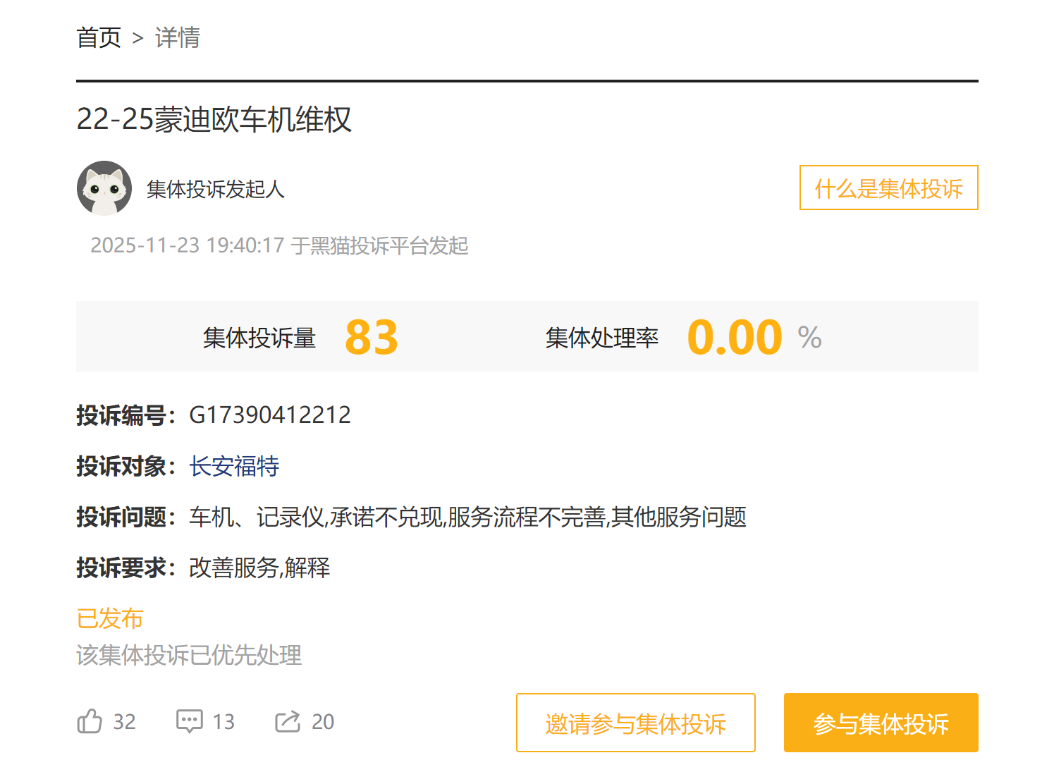 截至11月25日晚,共有83位长安福特蒙迪欧车主集体投诉长安福特汽车,车机、记录仪,承诺不兑现,服务流程不完善等问题。