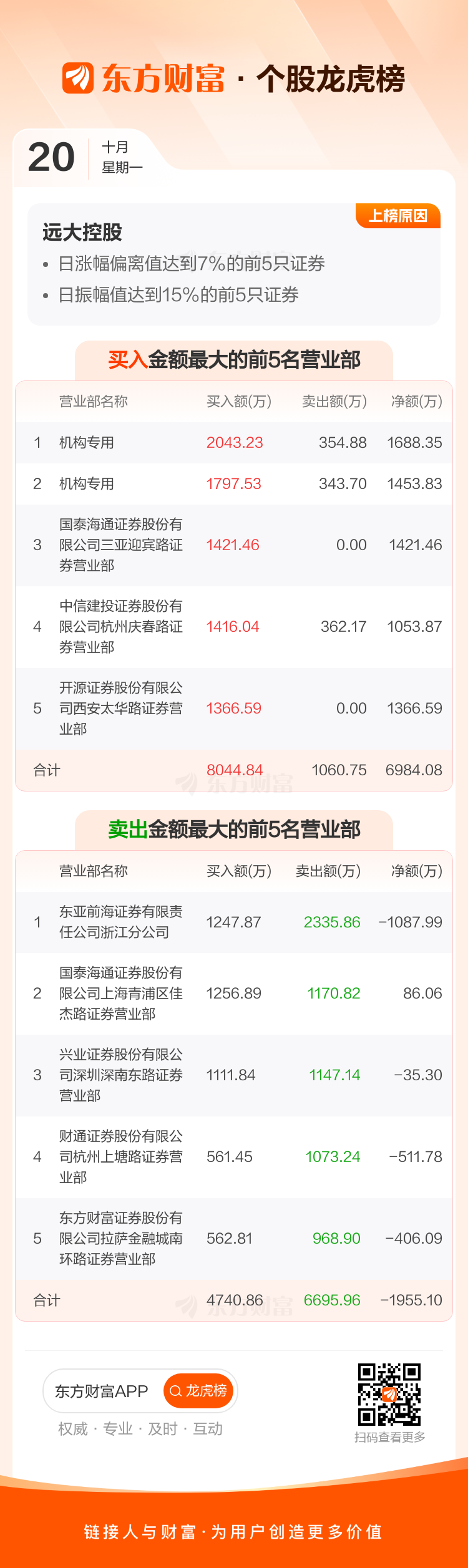交易所2025年10月20日公布的交易公开信息显示,远大控股因成为日涨幅偏离值达到7%的前5只证券、日振幅值达到15%的前5只证券上榜。远大控股当日收报10.74元,涨跌幅10.04%,偏离值9.02%,换手率18.65%,成交额9.56亿。