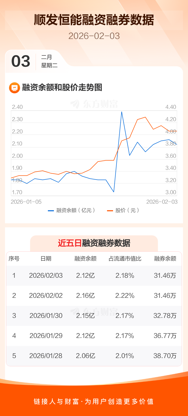交易所最新数据显示,顺发恒能于2026年2月3日获融资买入1325.76万元,融资偿还1762.88万元,当日融资净偿还437.12万元。目前,该股融资余额2.12亿,占流通市值比例为2.18%。