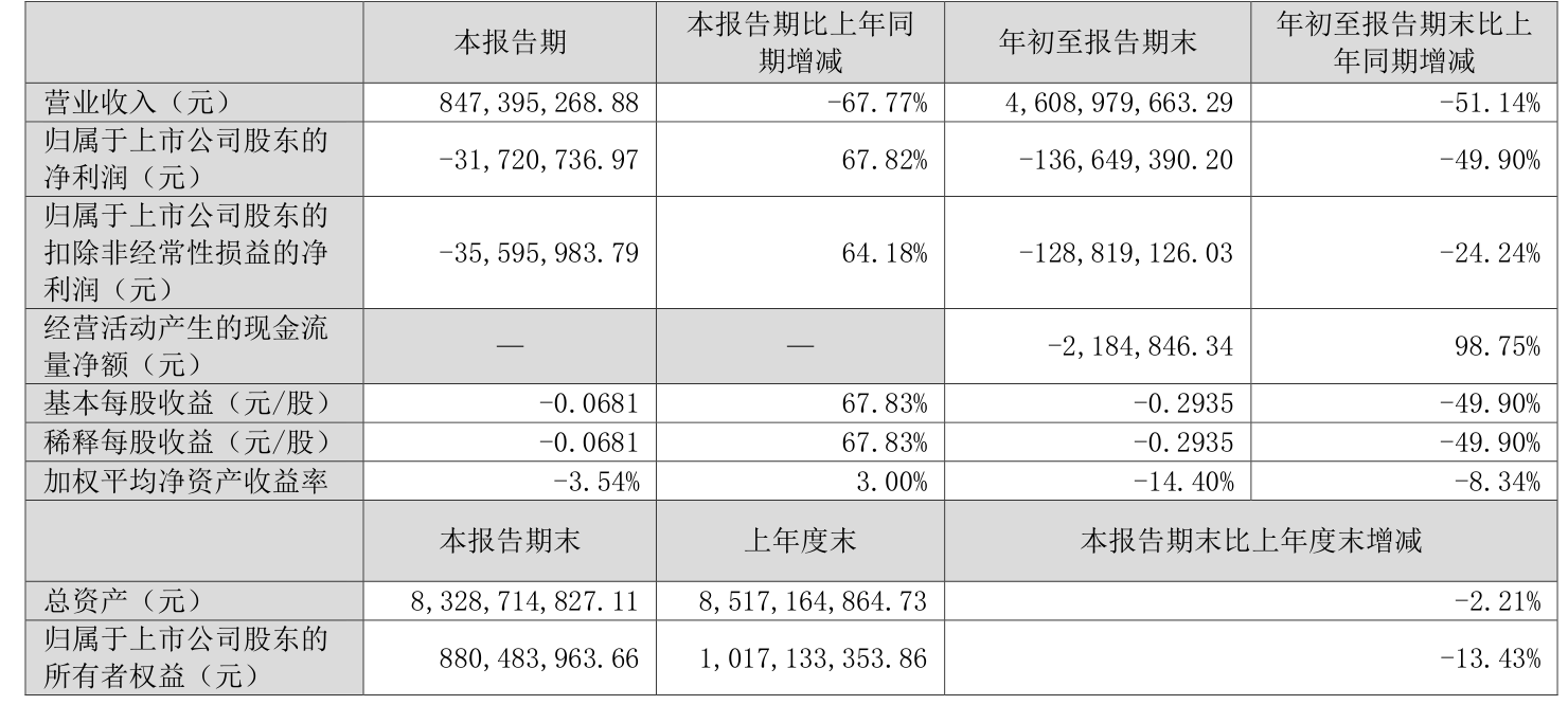中证智能财讯三木集团(000632)10月30日披露2025年第三季度报告。前三季度公司实现营业总收入46.09亿元,同比下降51.14%;归母净利润亏损1.37亿元,上年同期亏损9116.08万元;扣非净利润亏损1.29亿元,上年同期亏损1.04亿元;经营活动产生的现金流量净额为-218.48万元,上年同期为-1.75亿元;报告期内,三木集团基本每股收益为-0.2935元,加权平均净资产收益率为-14.40%。