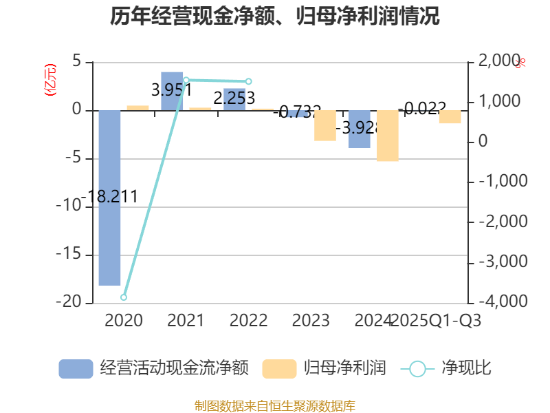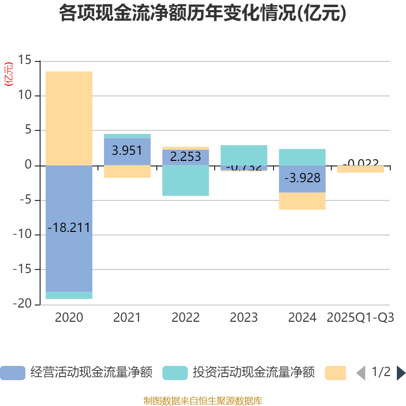 2025年前三季度,公司经营活动现金流净额为-218.48万元,同比增加1.72亿元;筹资活动现金流净额-1.02亿元,同比增加3.68亿元;投资活动现金流净额-221.98万元,上年同期为2.36亿元。