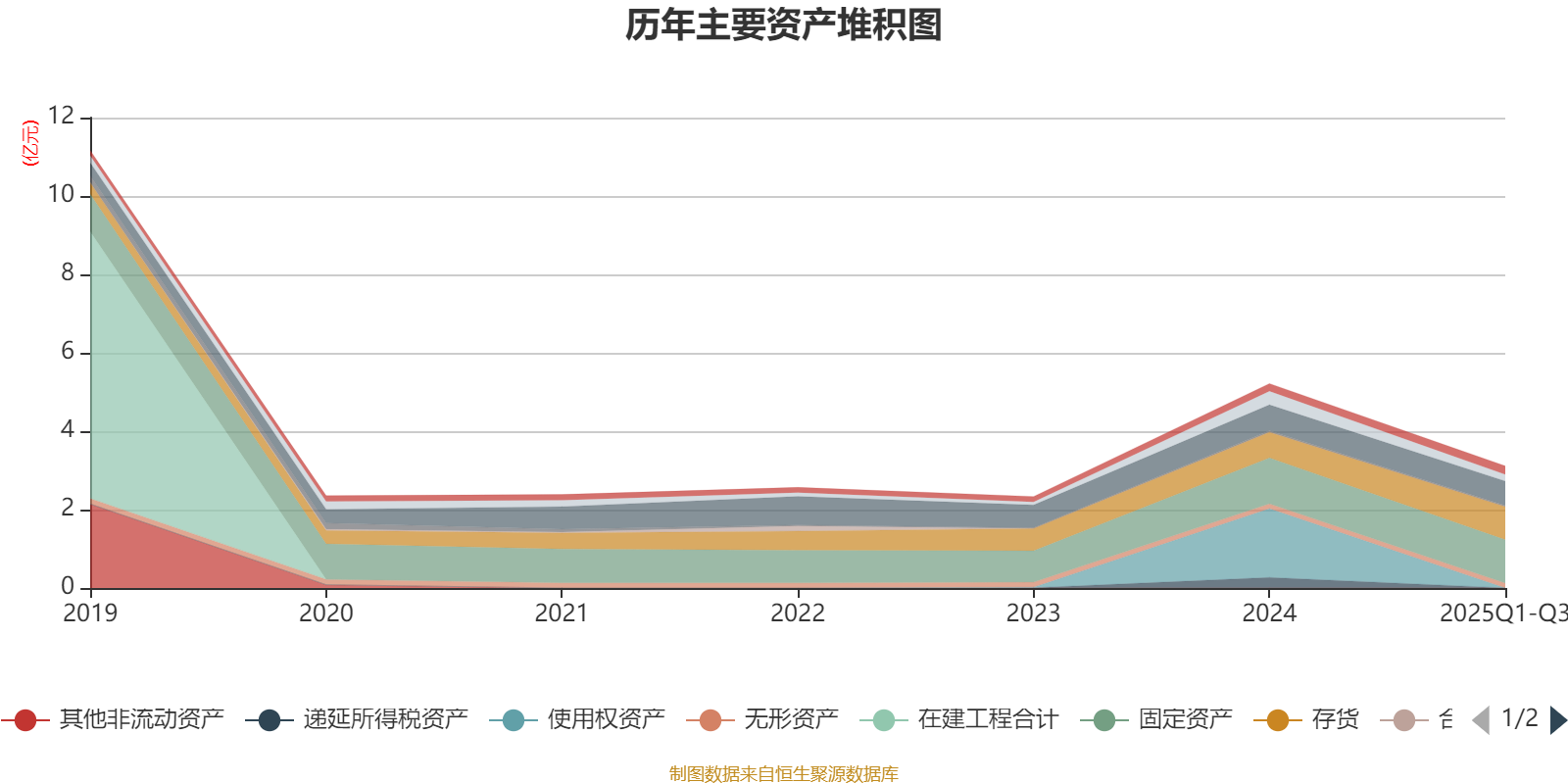 资产重大变化方面,截至2025年三季度末,公司使用权资产较上年末减少100%,占公司总资产比重下降33.69个百分点;存货较上年末增加28.39%,占公司总资产比重上升14.5个百分点;固定资产较上年末减少5.67%,占公司总资产比重上升13.04个百分点;应收票据及应收账款较上年末减少6.89%,占公司总资产比重上升7.1个百分点。