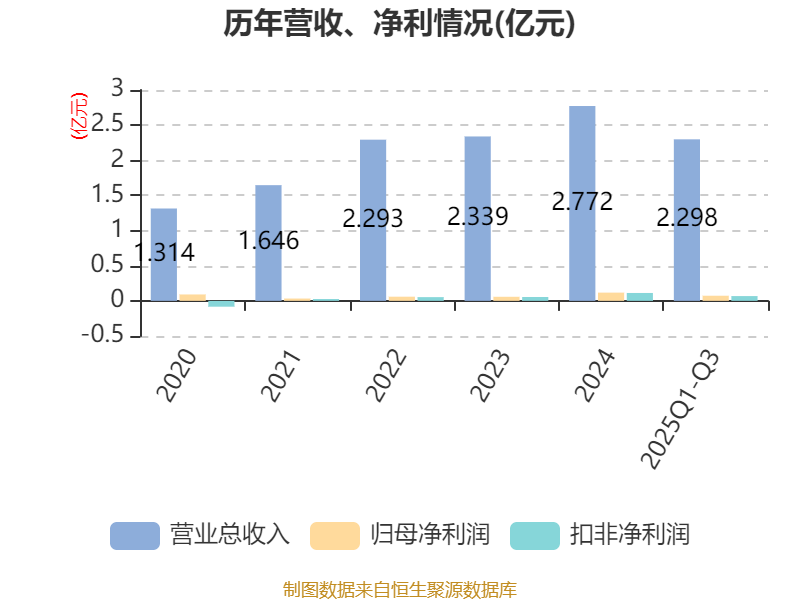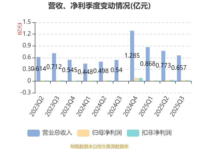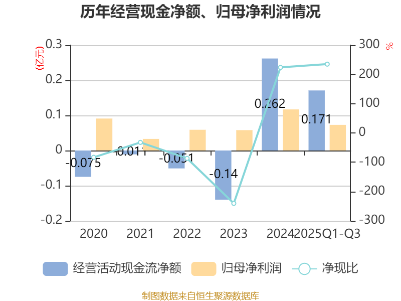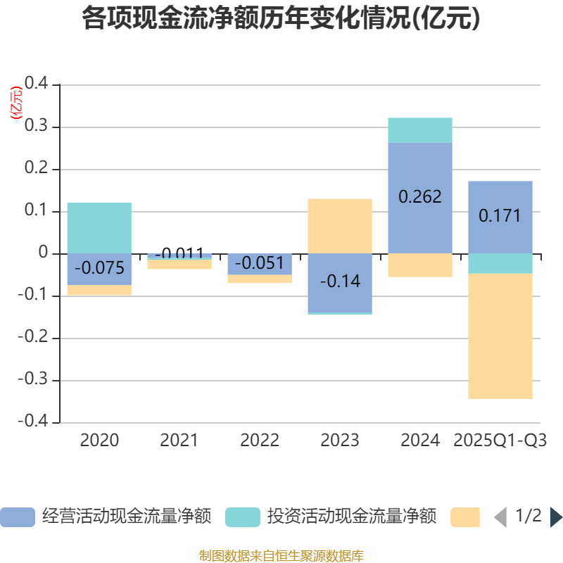2025年前三季度,公司经营活动现金流净额为1706.47万元,同比增长3989.77%;筹资活动现金流净额-2967.88万元,同比减少3535.42万元;投资活动现金流净额-479.76万元,上年同期为720.14万元。