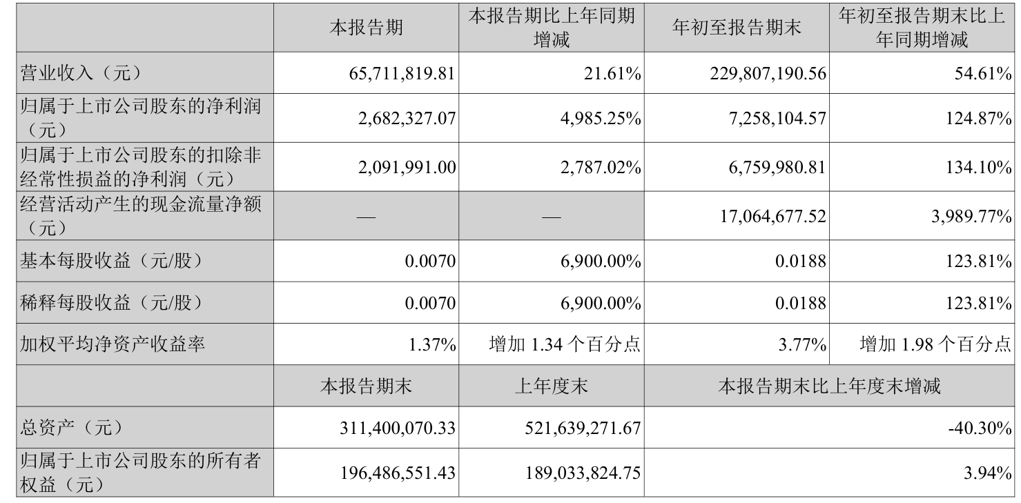 中证智能财讯合金投资(000633)10月21日披露2025年第三季度报告。前三季度公司实现营业总收入2.3亿元,同比增长54.61%;归母净利润725.81万元,同比增长124.87%;扣非净利润676万元,同比增长134.10%;经营活动产生的现金流量净额为1706.47万元,同比增长3989.77%;报告期内,合金投资基本每股收益为0.0188元,加权平均净资产收益率为3.77%。