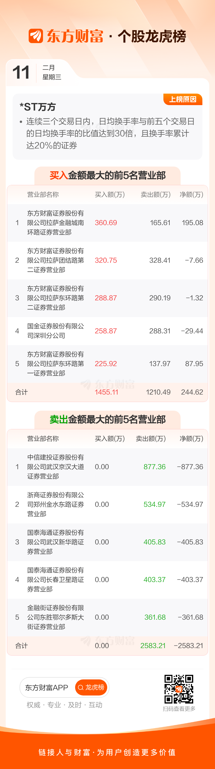 交易所2026年2月11日公布的交易公开信息显示,*ST万方因成为连续三个交易日内,日均换手率与前五个交易日的日均换手率的比值达到30倍,且换手率累计达20%的证券上榜。*ST万方当日收报2元,涨跌幅5.26%,换手率17.93%,成交额1.05亿。异常期间2月10日至2月11日,期间涨幅10.50%,累计偏离值36.00%,区间成交额2.07亿。
