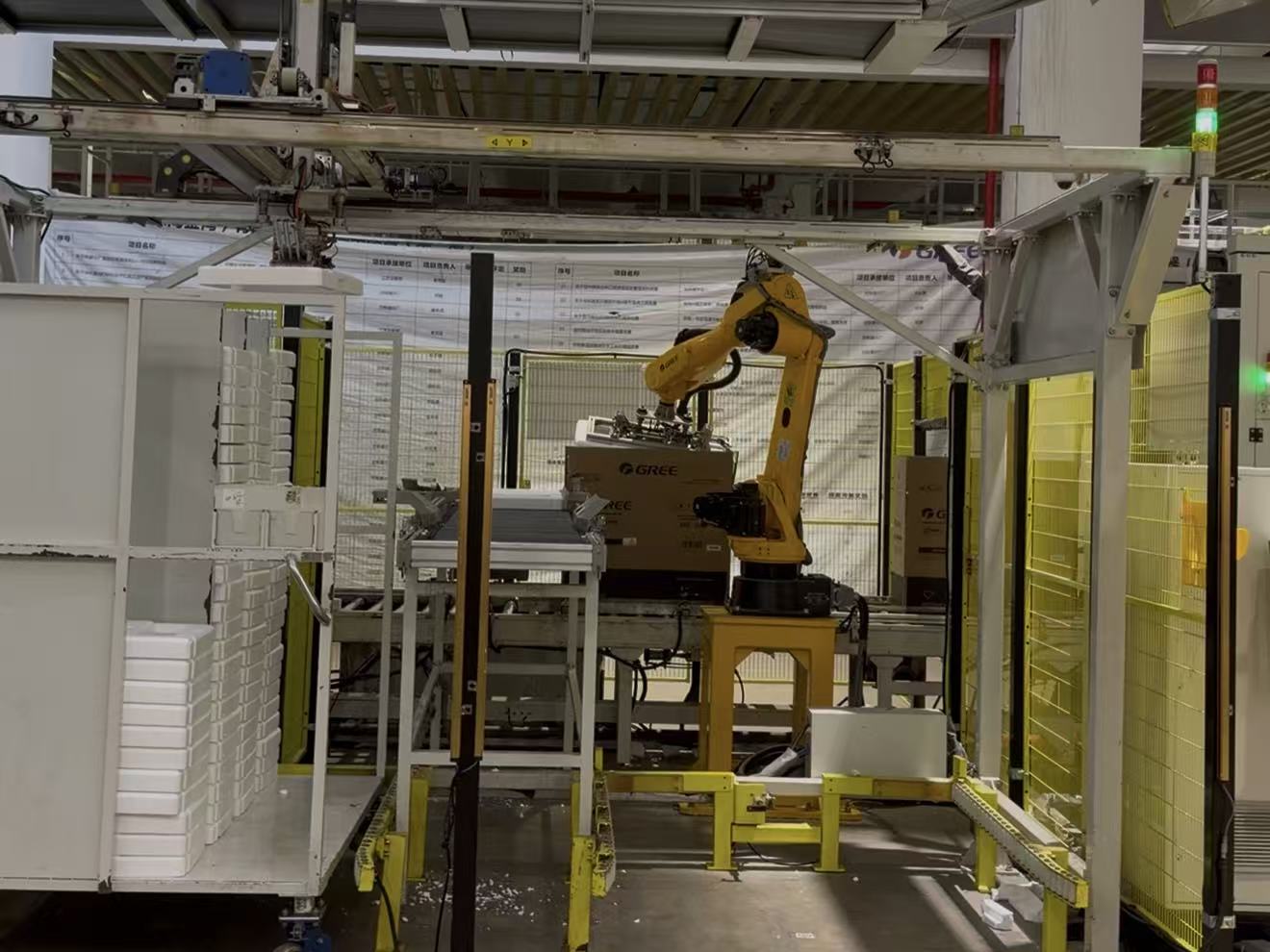 以套袋包装环节为例,记者看到现场的工业机器人会先将压平的纸箱铺开,精准撑起四角,随后进入装箱流程。为了让纸箱与空调机身更紧密贴合,搭载仿生臂的机器人会一边套箱,一边“试探”着有节奏的轻微摇晃动作,从而让包装自然顺滑地完成。
