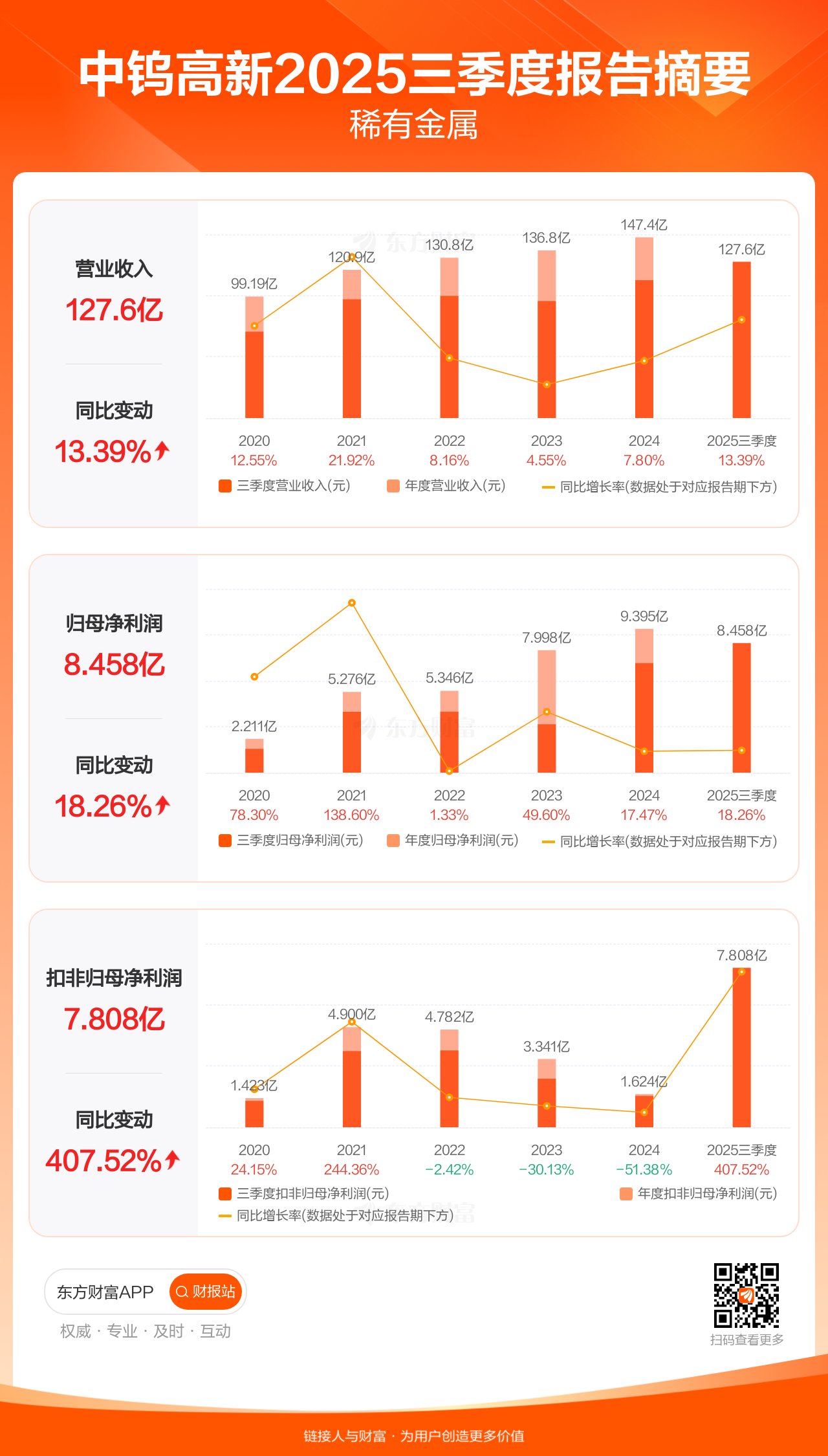 中钨高新10月27日发布2025年三季报显示,公司前三季实现营业收入127.55亿元,同比增长13.39%;归母净利润8.46亿元,同比增长18.26%;扣非归母净利润7.81亿元,同比增长407.52%。