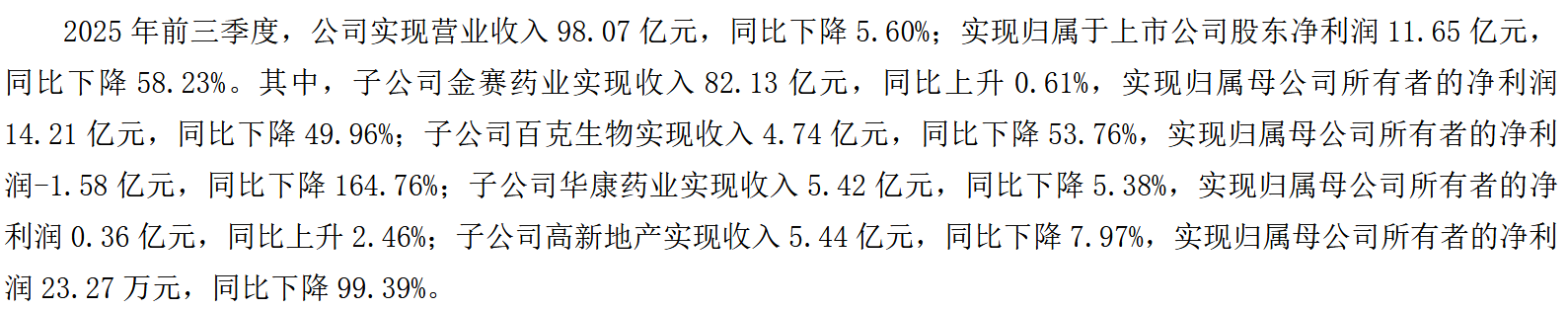 这一变化并未止步。2025年前三季度,金赛药业实现收入82.13亿元,同比微增0.61%,但归母净利润同比下降49.96%至14.21亿元。收入端的相对稳定,与利润端的大幅回落形成对比,显示盈利模式承压。