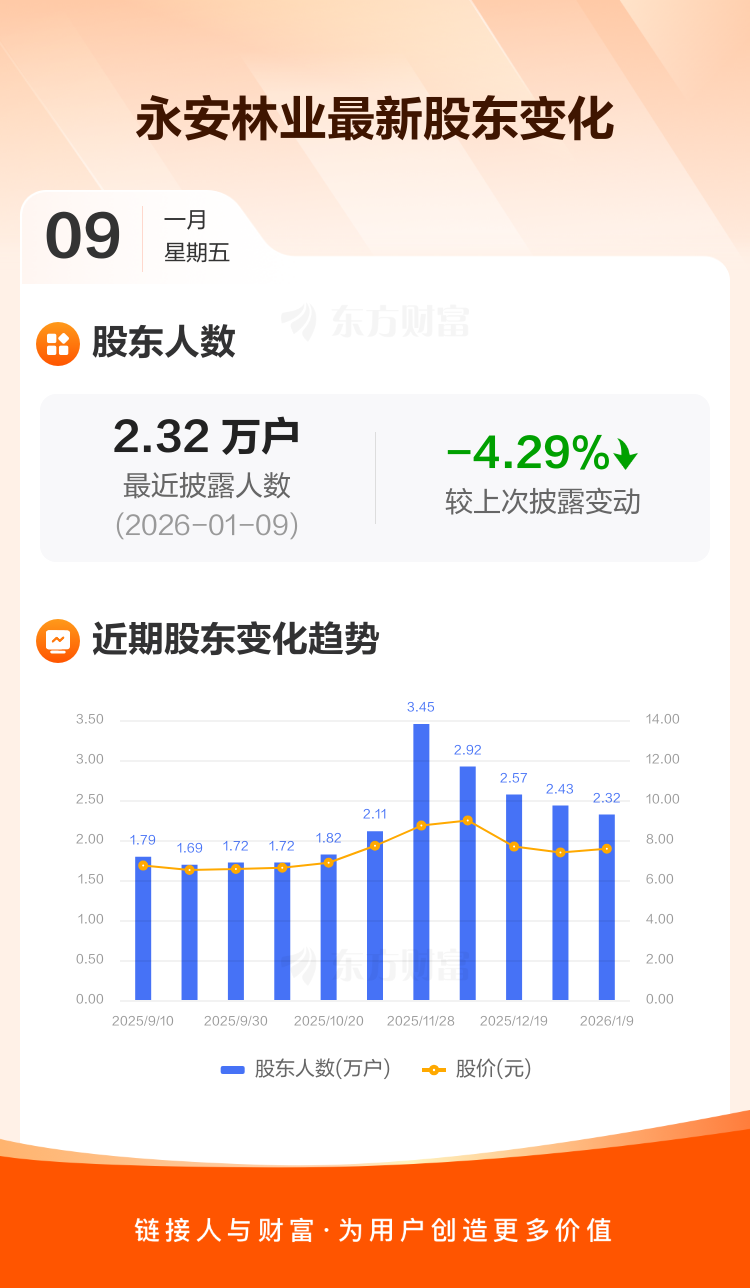 永安林业:截至1月9日最新股东户数2.32万户,较上期减少4.29%