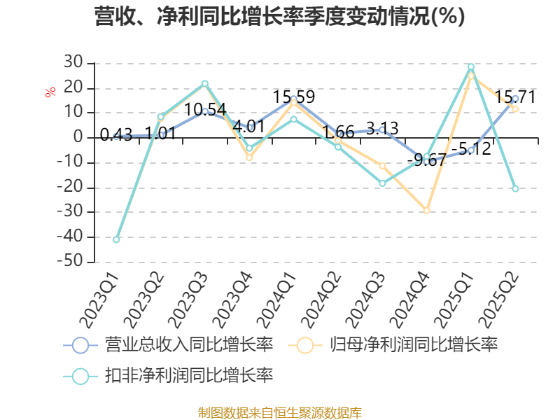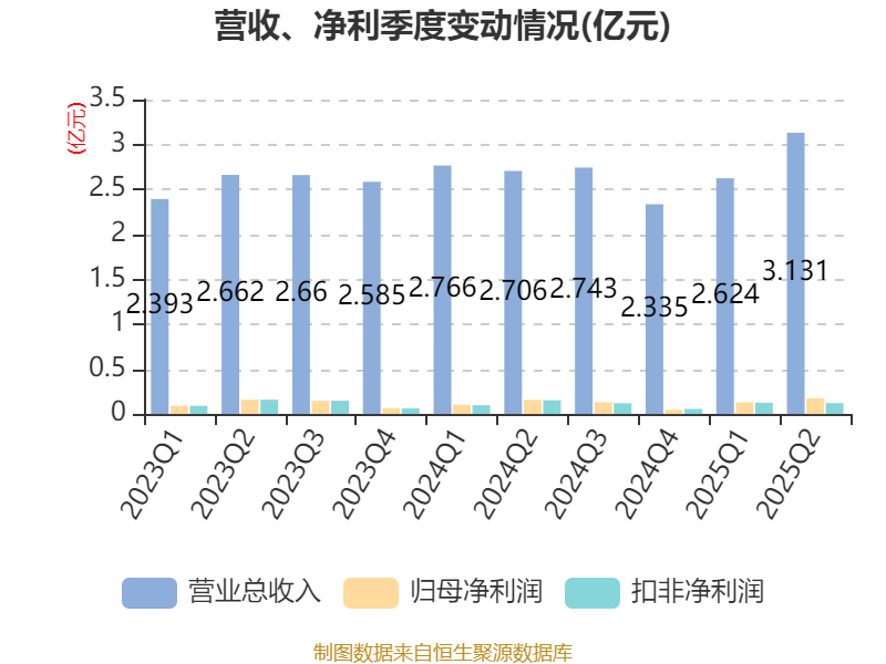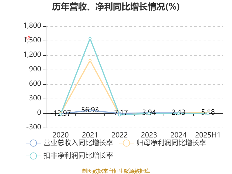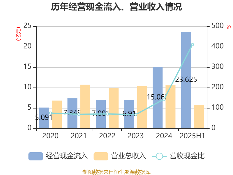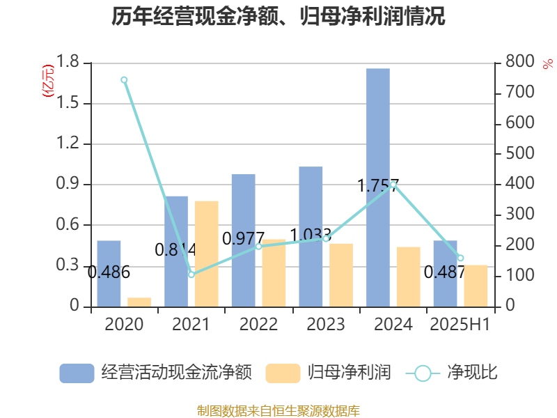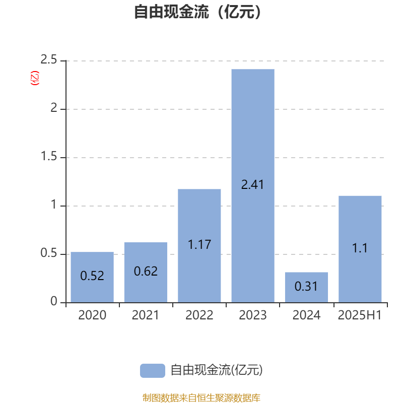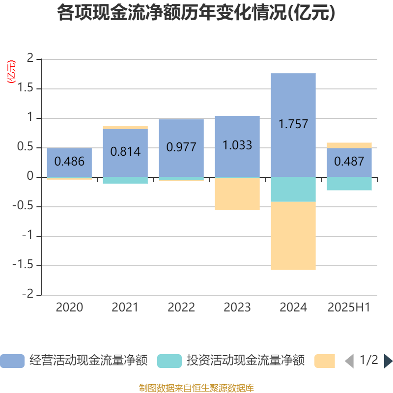 2025年上半年,公司经营活动现金流净额为4866.2万元,同比下降41.31%;筹资活动现金流净额934.15万元,同比增加5264.11万元;投资活动现金流净额-2282.31万元,上年同期为-732.4万元。