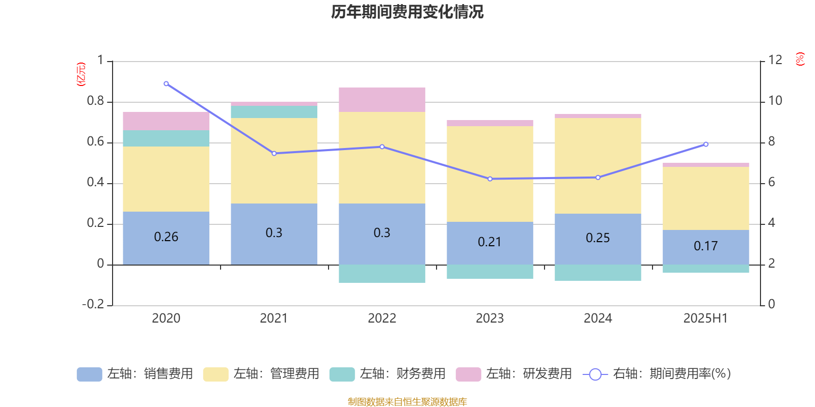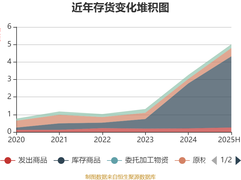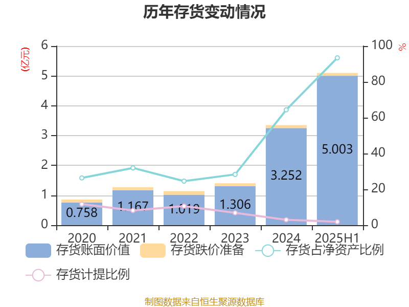 从存货变动来看,截至2025年上半年末,公司存货账面价值为5亿元,占净资产的93.41%,较上年末增加1.75亿元。其中,存货跌价准备为959.94万元,计提比例为1.88%。