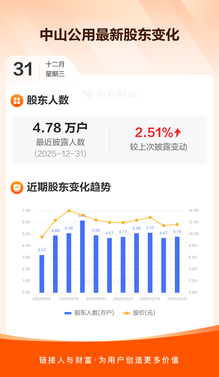 中山公用:截至12月31日最新股东户数4.78万户,较上期增加2.51%