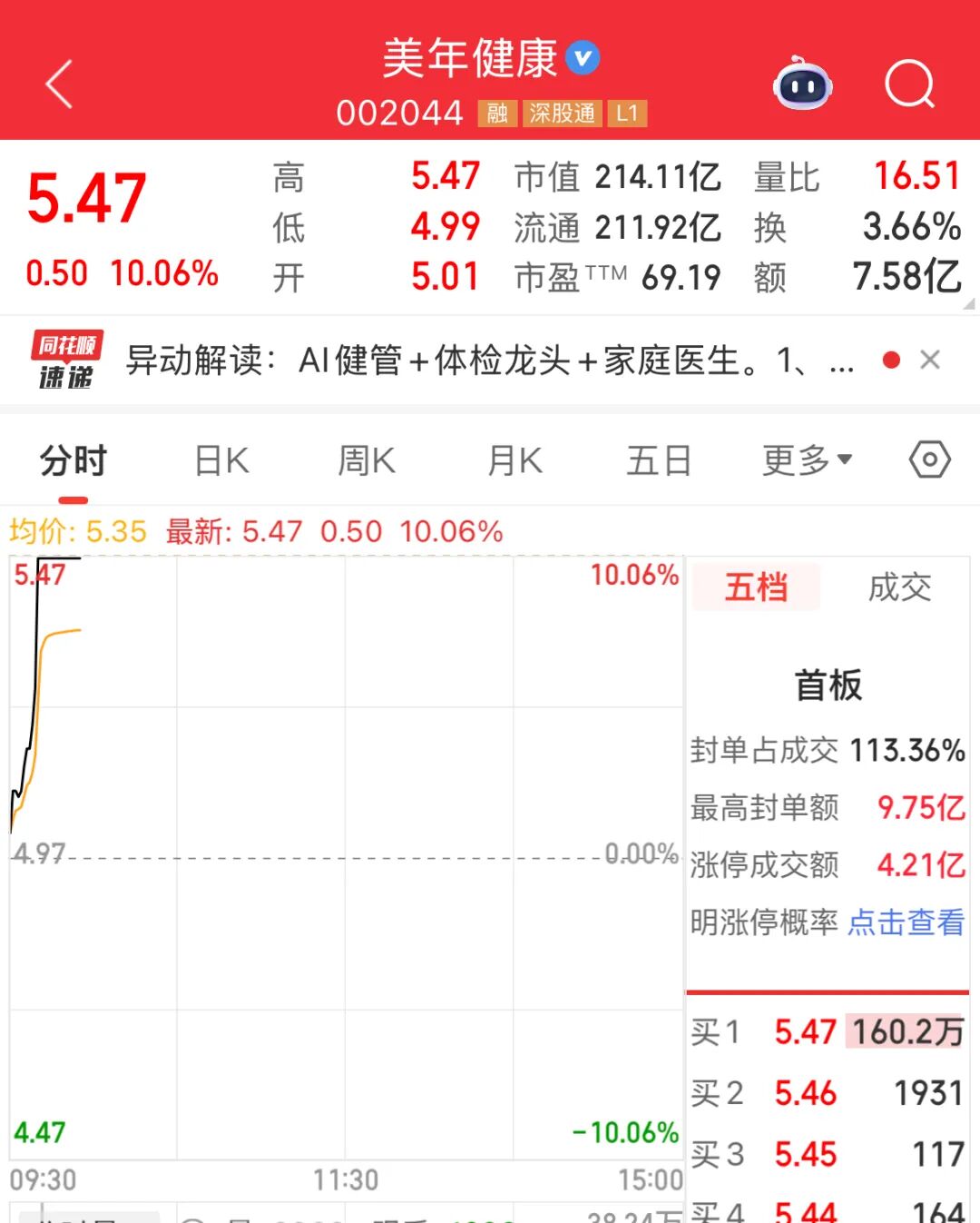 AI医疗概念异动拉升,美年健康直线涨停,华人健康、卫宁健康、迪安诊断、创业慧康等跟涨。消息面上,此前国家医保局表示,2026年将深入推进智慧医保,引导医疗机构、医药企业、科研机构等广泛参与推动医保领域人工智能发展。