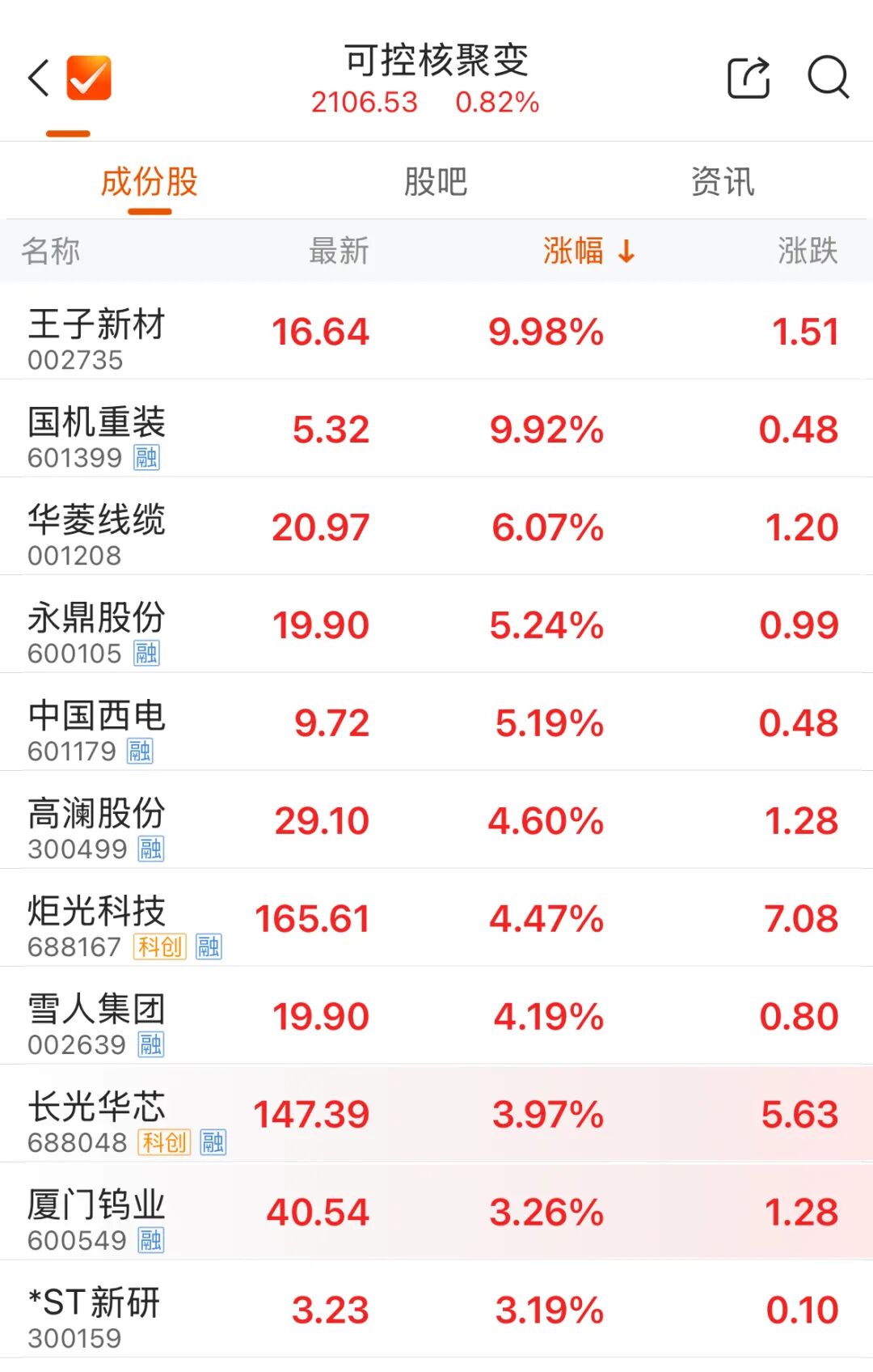 可控核聚变概念走高。国机重装、王子新材涨停,华菱线缆、永鼎股份、中国西电等跟涨。