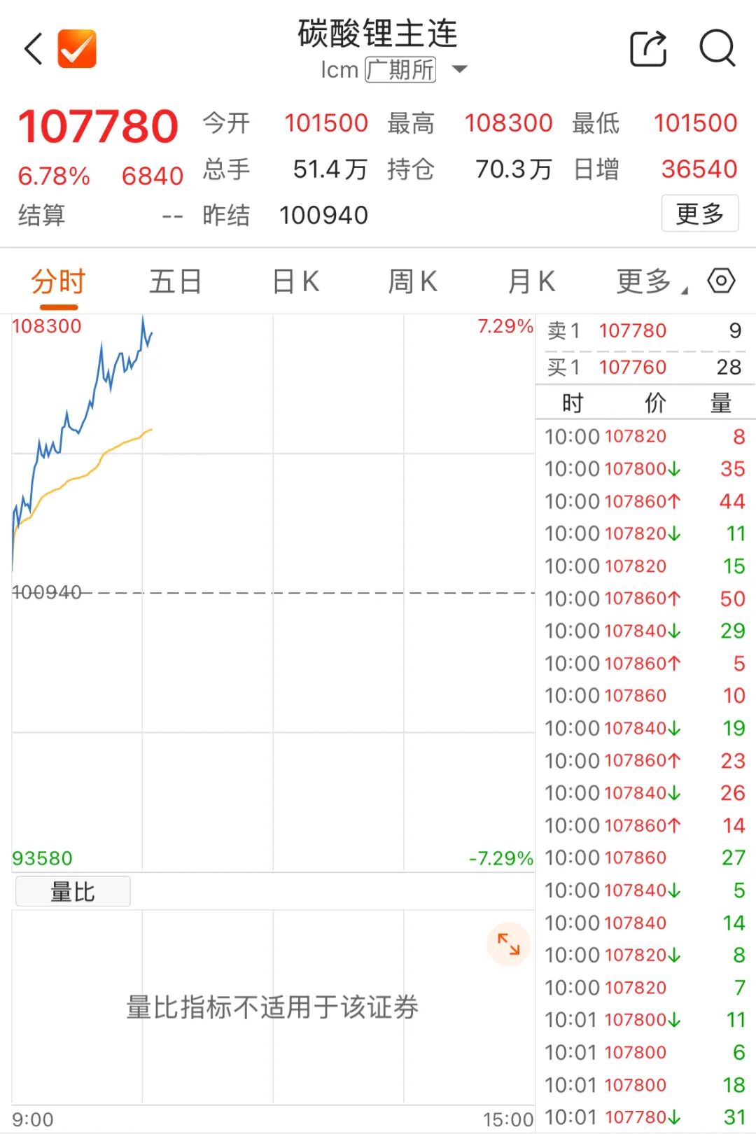 早盘,锂矿概念走高,国城矿业(000688)、金圆股份(000546)盘初直线涨停,大中矿业、盛新锂能、盐湖股份等跟涨。港股锂电池股亦走强,截至发稿,赣锋锂业涨超5%、天齐锂业涨超4%。消息面上,广期所碳酸锂主力合约盘中一度涨超7%,截至发稿仍涨6.78%。